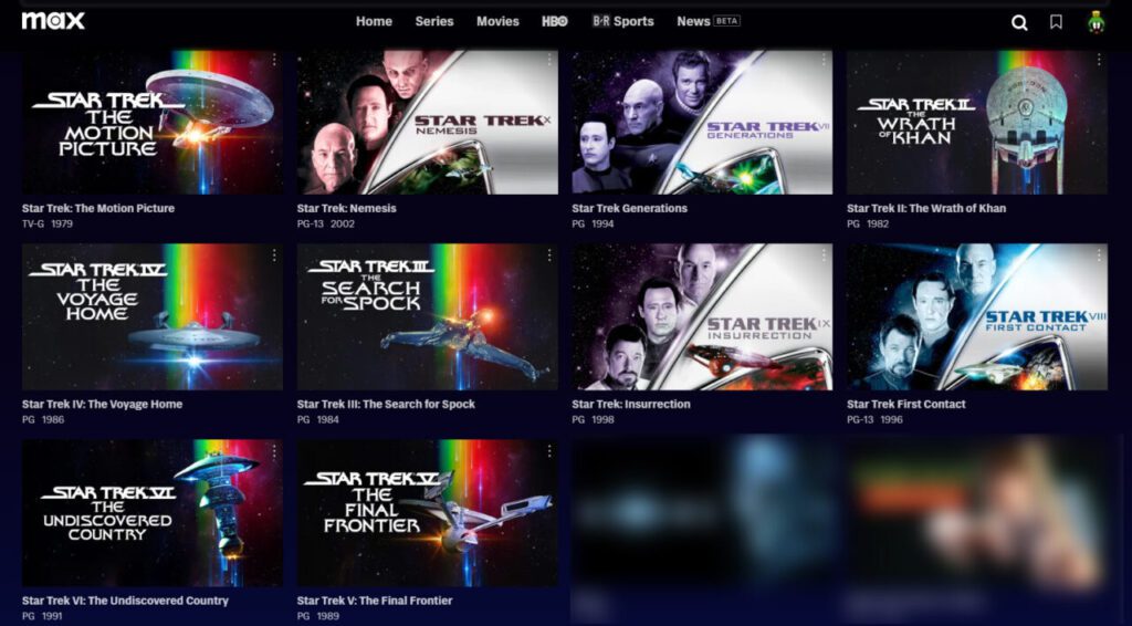 از ۱ ژانویه ۲۰۲۴، شش فیلم کلاسیک استار ترک از دوران TOS (The Motion Picture، The Wrath of Khan، The Search for Spock، The Voyage Home، The Final Frontier و The Undiscovered Country) به همراه چهار فیلم دوران TNG (Generations، First Contact، Insurrection و Nemesis) بهصورت انحصاری روی Max پخش میشوند.