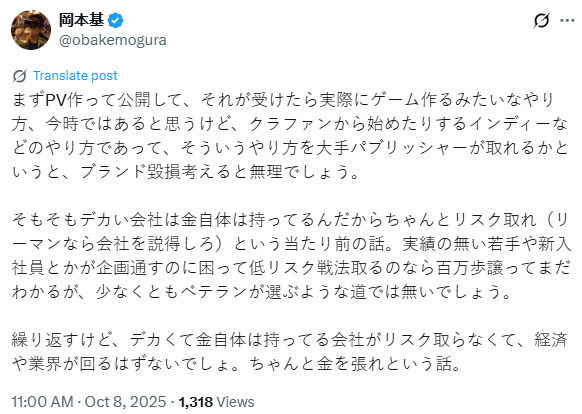 «ایده ساخت یک ویدئوی تبلیغاتی (PV) قبل از تولید بازی اصلی و بررسی بازخورد مخاطبان، بهویژه در میان استودیوهای مستقل که با سرمایهگذاری جمعی کار میکنند، رایج شده است. اما شرکتهای بزرگ به دلیل ترس از آسیب به برندشان از این روش پرهیز میکنند.»